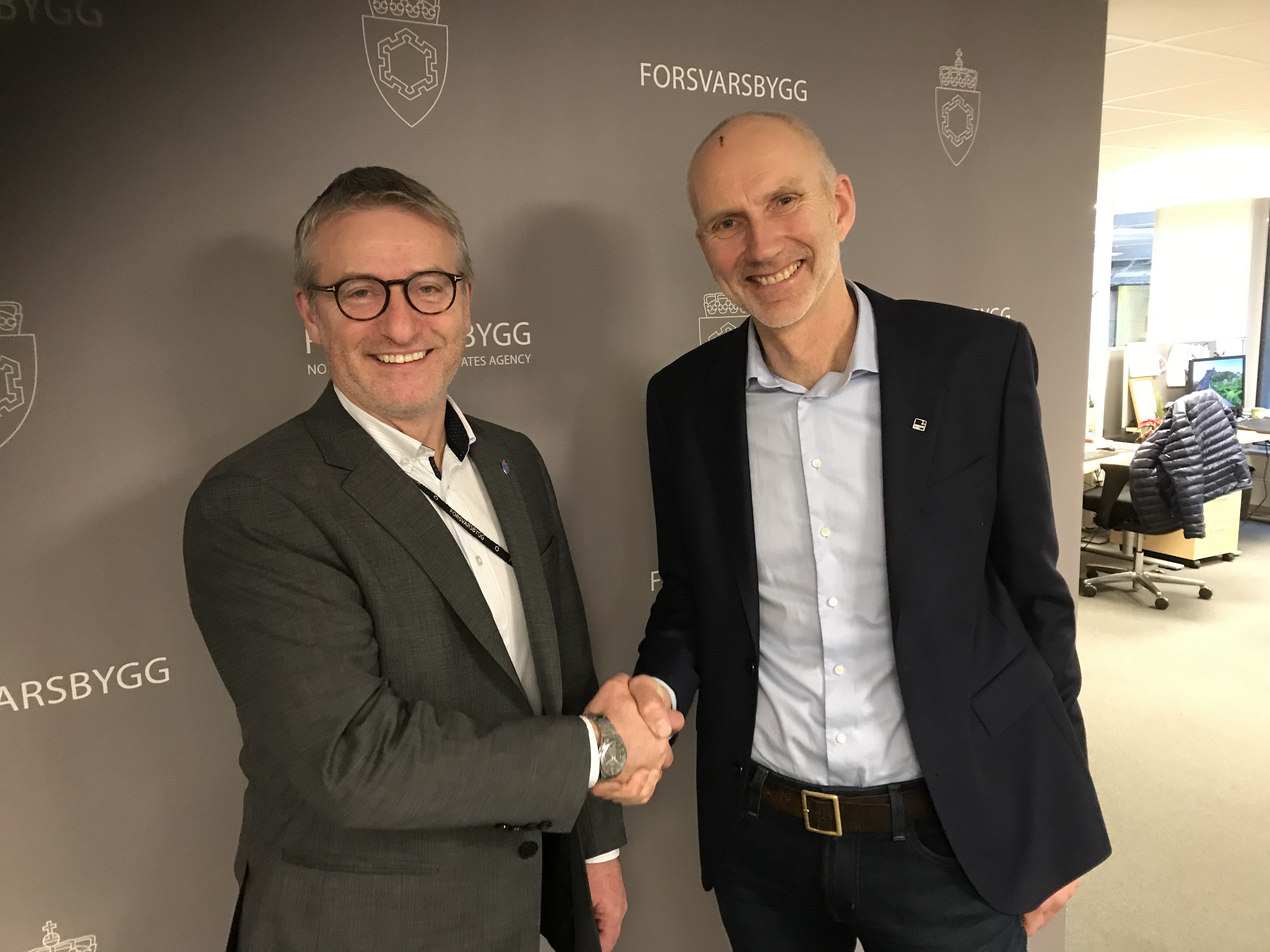 På bildet: Direktør Thorbjørn Thoresen i Forsvarsbygg (t.v.) og konserndirektør Hans Olav Sørlie i Veidekke Bygg.